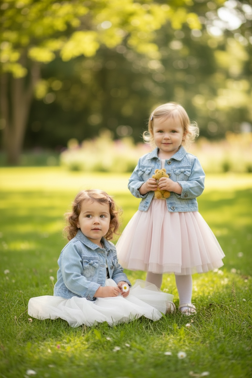 Abito elegante e sfizioso, con gonna in tulle, abbinata a Giubbino in jeans con brillantini modello crop elasticizzato con bottoni e colletto. Vendibili anche separatamente (Giubbino €24,5 e abito €20,50)