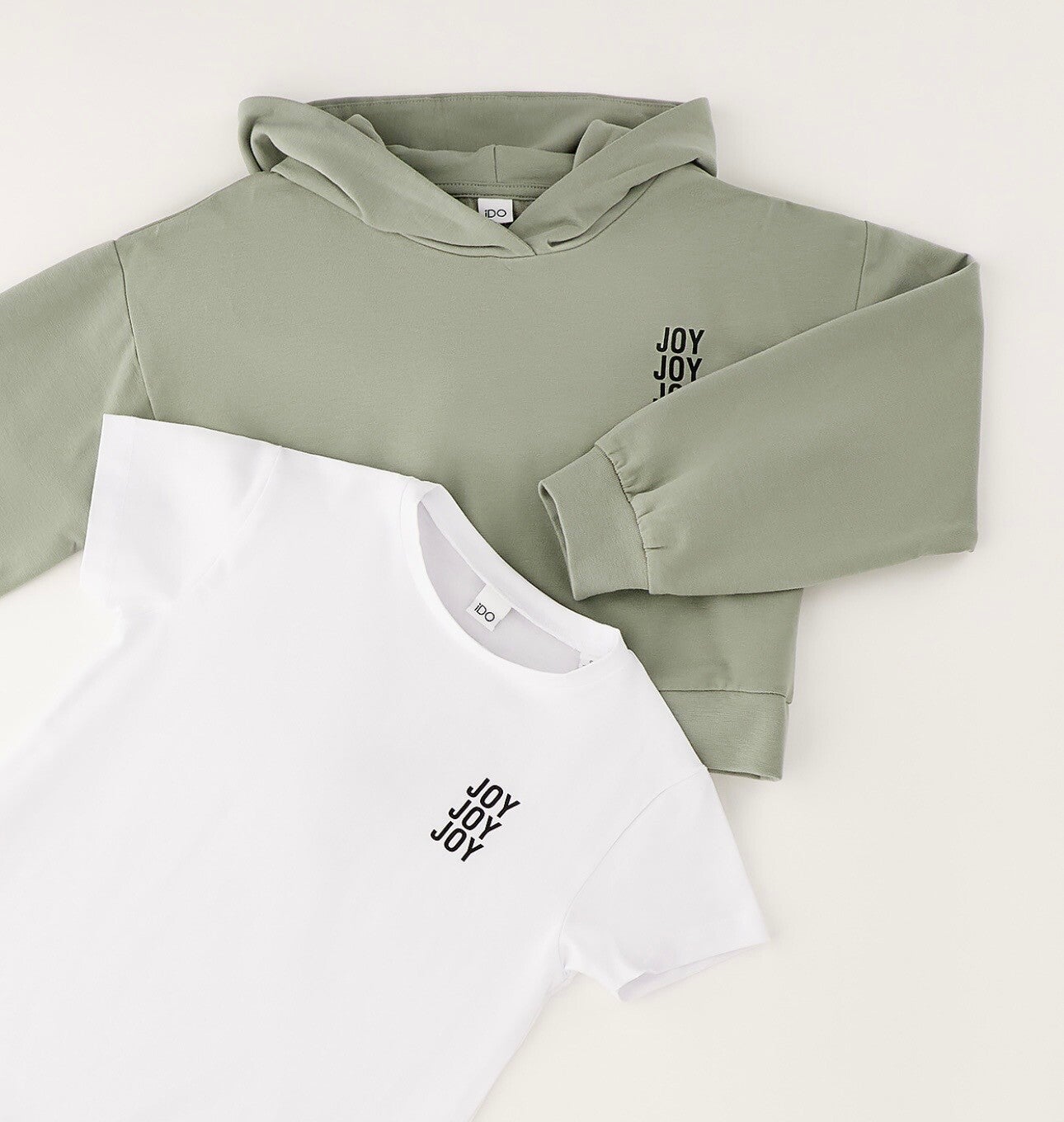 Felpa cotone 100% Ido composto da felpa chiusa con cappuccio verde salvia, t shirt basica bianca da mettere sotto. Da 8 a 16 anni