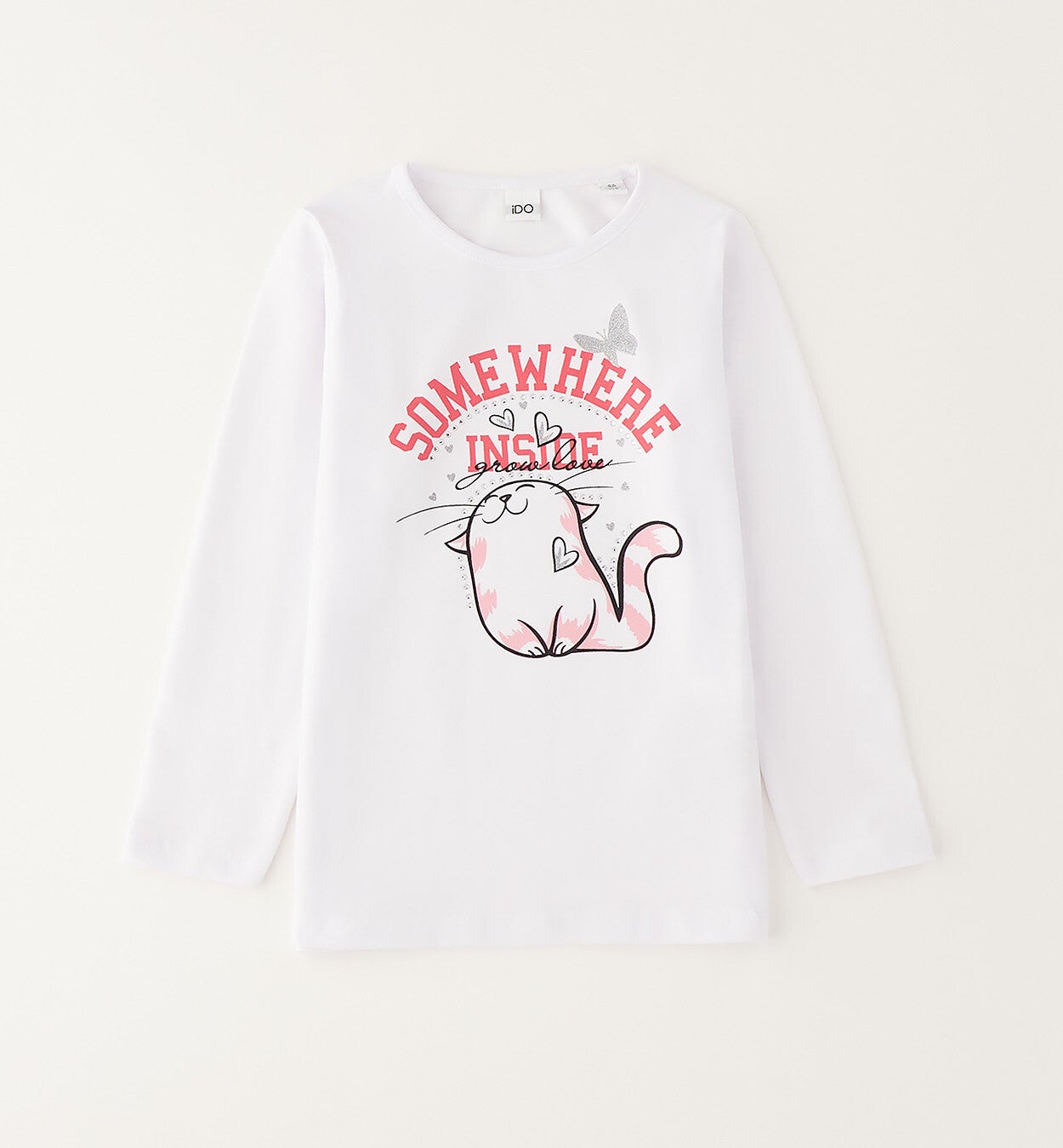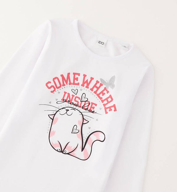 Maglia cotone 100% Ido, girocollo base bianca con stampa gattino. Da 12 mesi a 8 anni