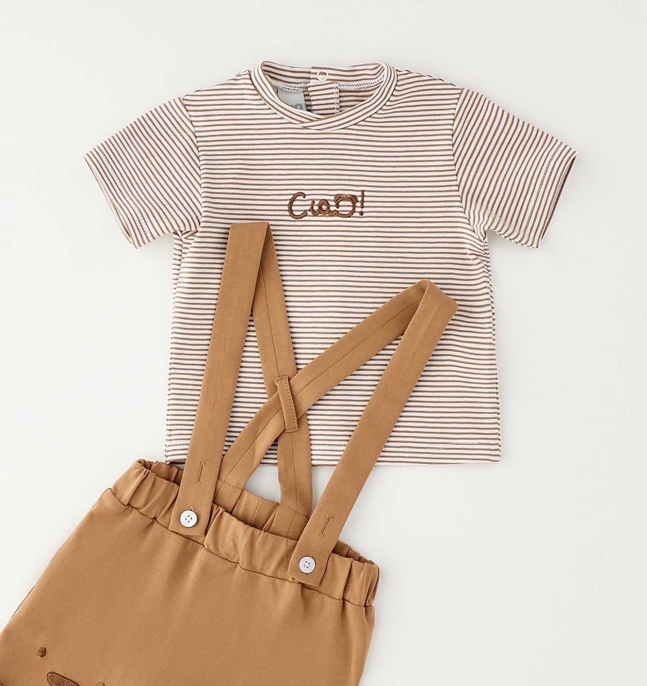 Completo Ido in puro cotone composto da t shirt rigata e pantaloncino morbido con bretelle. Da 1 a 9 mesi