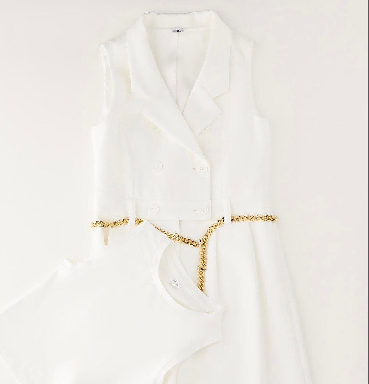 Tuta intera con corpetto a doppio petto scollo a V, cintura a catenella oro inclusa, canotta da mettere sotto inclusa. ido da 8 a 16 anni