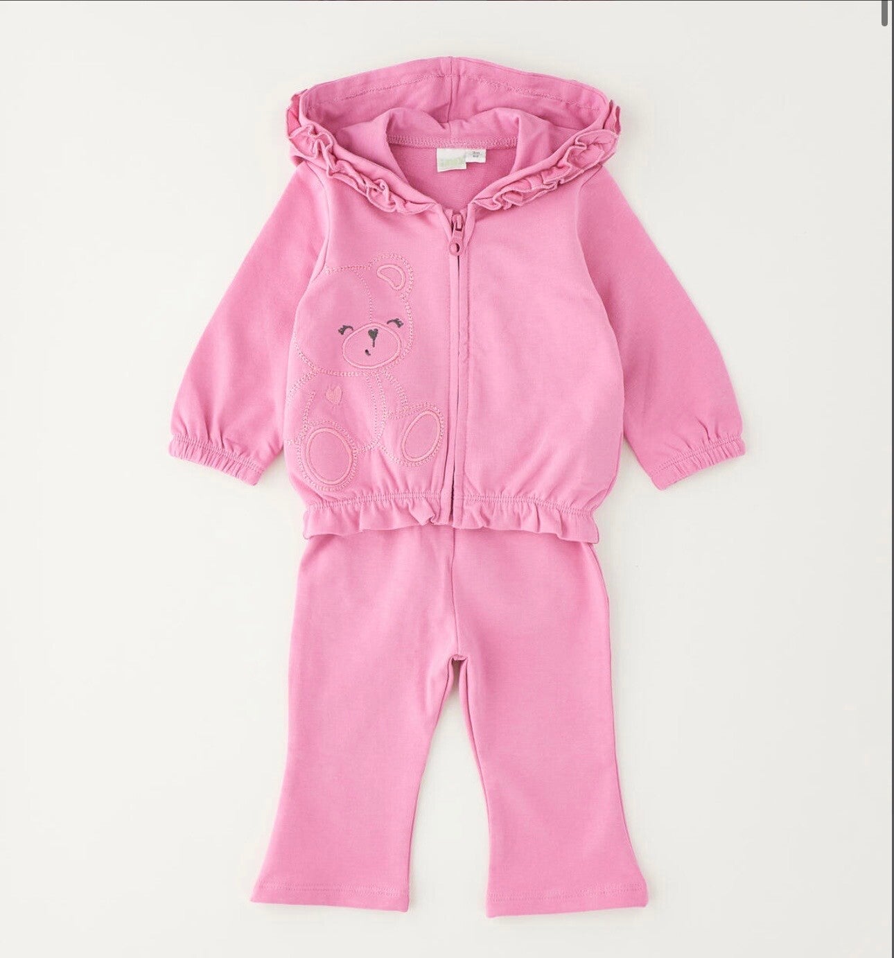 Tuta cotone puro Ido composta da felpa con zip e cappuccio e pantalone morbido. Colore orchidea con stampa orsetto. Da 1 a 9 mesi