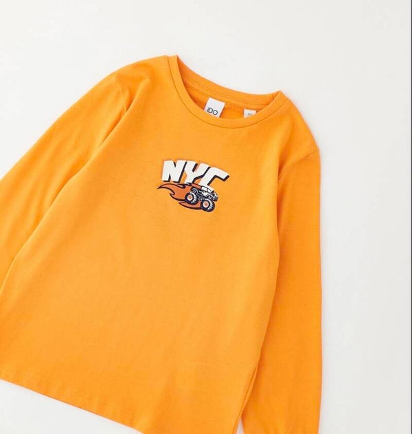 Maglia cotone girocollo Ido colore arancio con stampa. Da 12 mesi a 8 anni
