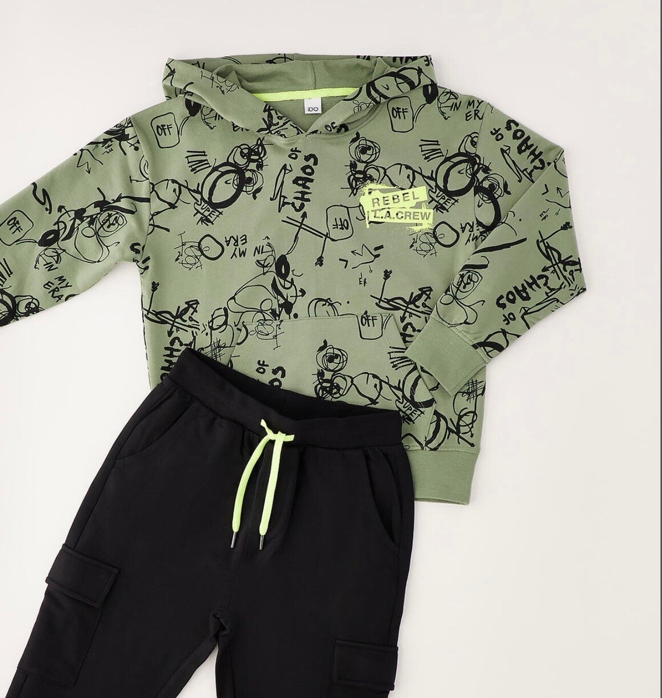Tuta cotone IDo composta da felpa con cappuccio chiusa e pantalone. Colore salvia e nero da 8 a 16 anni