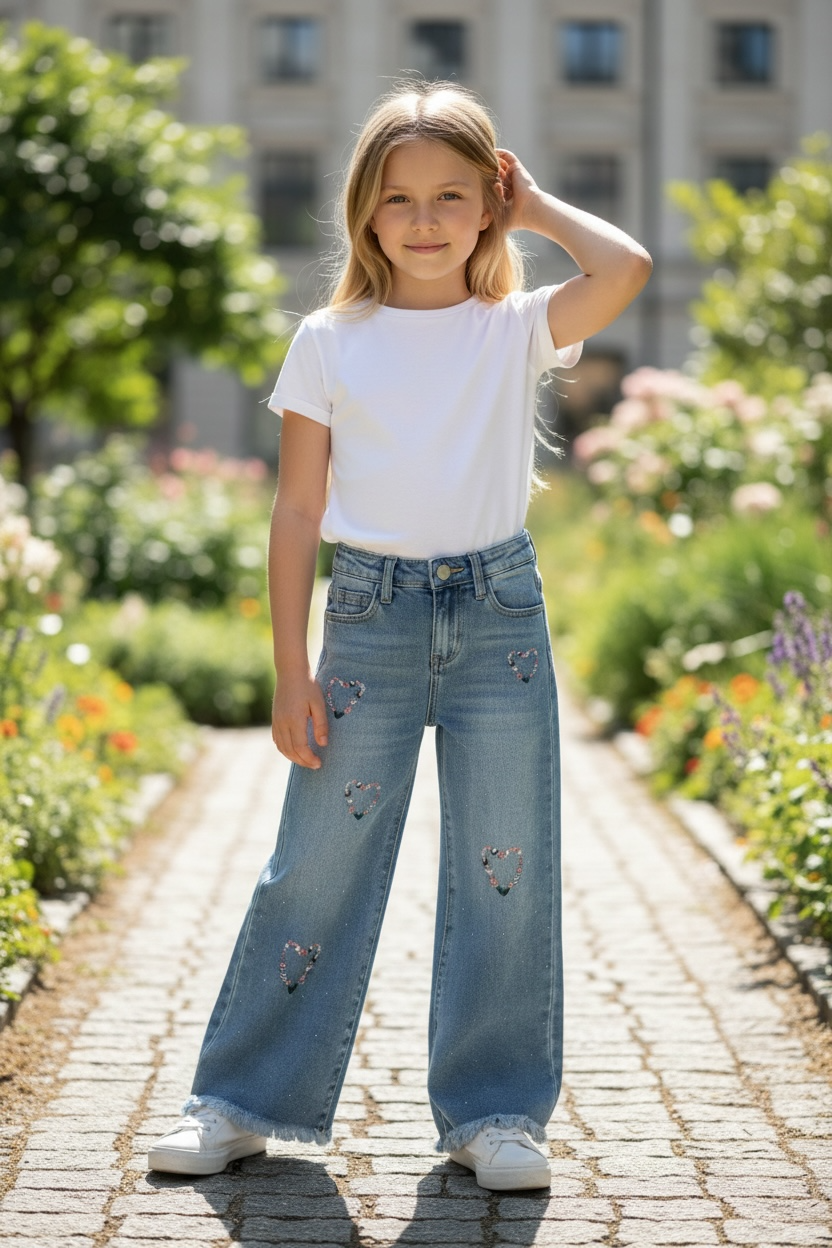 Jeans elasticizzato con bottone e coulisse in vita, gamba larga con frange in fondo, strass e cuoricini. Da 4 a 14 anni