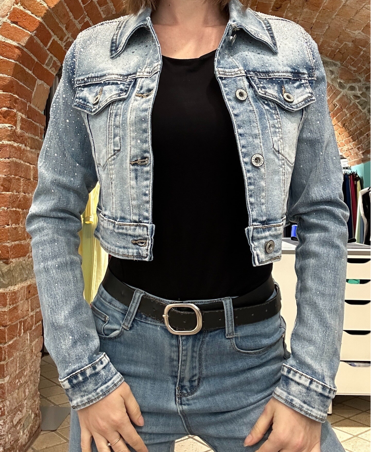 Giubbino in jeans modello crop a scatoletta con strass, lavaggio chiaro. Da S a XL