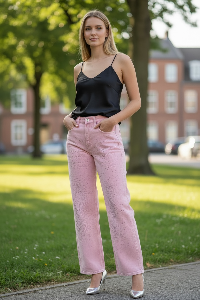 Jeans gamba larga colore rosa con strass rosa e argento davanti, casual o elegante. da S a XL